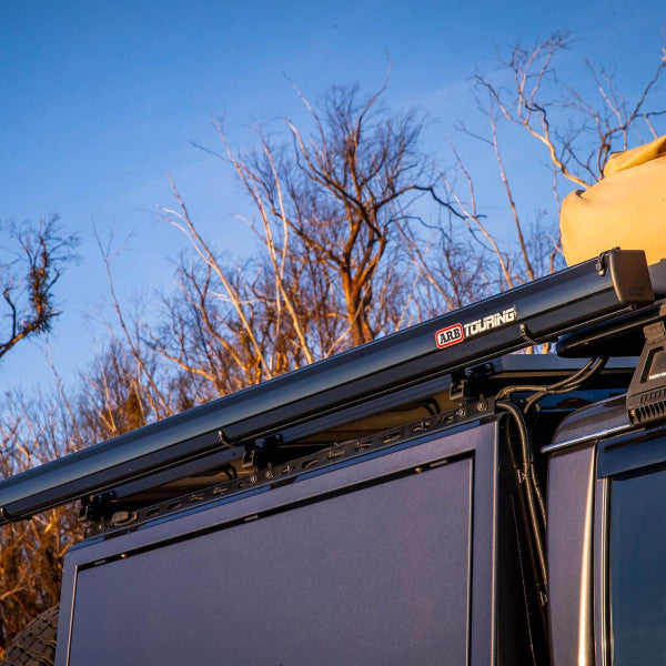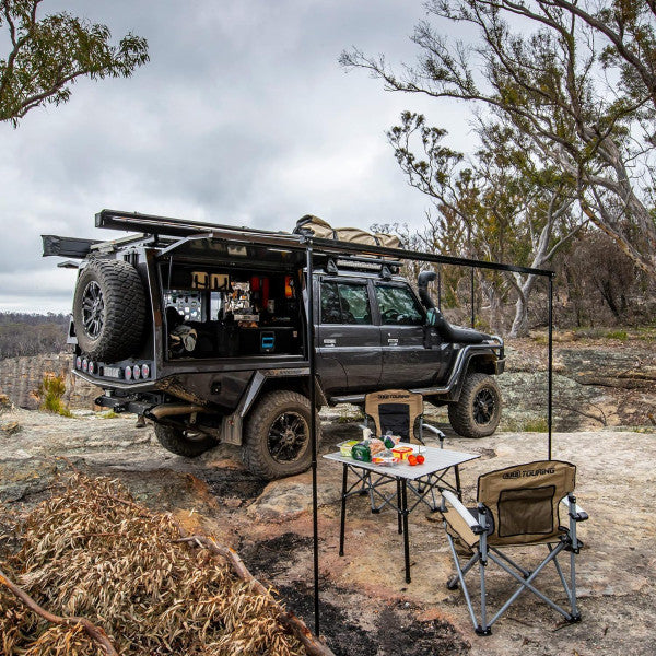 The ARB Awning & Light Kit provides a comprehensive shelter and lighting solution, perfect for camping or outdoor activities. The kit includes the ARB awning with anodized height-adjustable telescopic legs, thick reinforced aluminum extrusions, and a built-in LED light strip that offers up to 1200 lumens. The light strip, located in the awning roof, offers both cool white and amber lighting modes, with dimming options, powered by a fused cig socket plug.