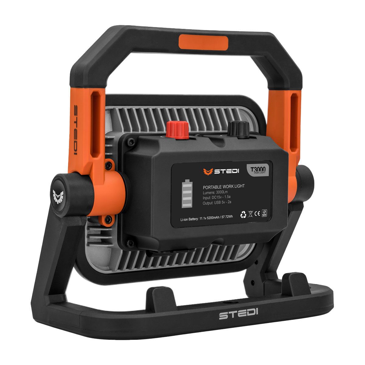 The T3000 is your next portable super light. With just a 4 hour charge time, you will be able to achieve maximum illumination from between 2 hours to 56 hours on low mode. The T3000 is mounted in a durable magnetic frame, allowing the light to be positioned on any metallic surface and structure. The T3000 can also be directed as needed by rotating the 170° swivel that is integrated into the mount. The battery can simultaneously act as a power bank, allowing you to charge any smart device via the USB output.